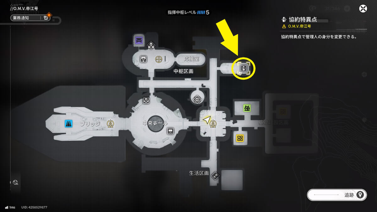 帝江号の中枢区画にある「協約特異点」を調べると、管理人の身分(見た目)を切り替えられます。