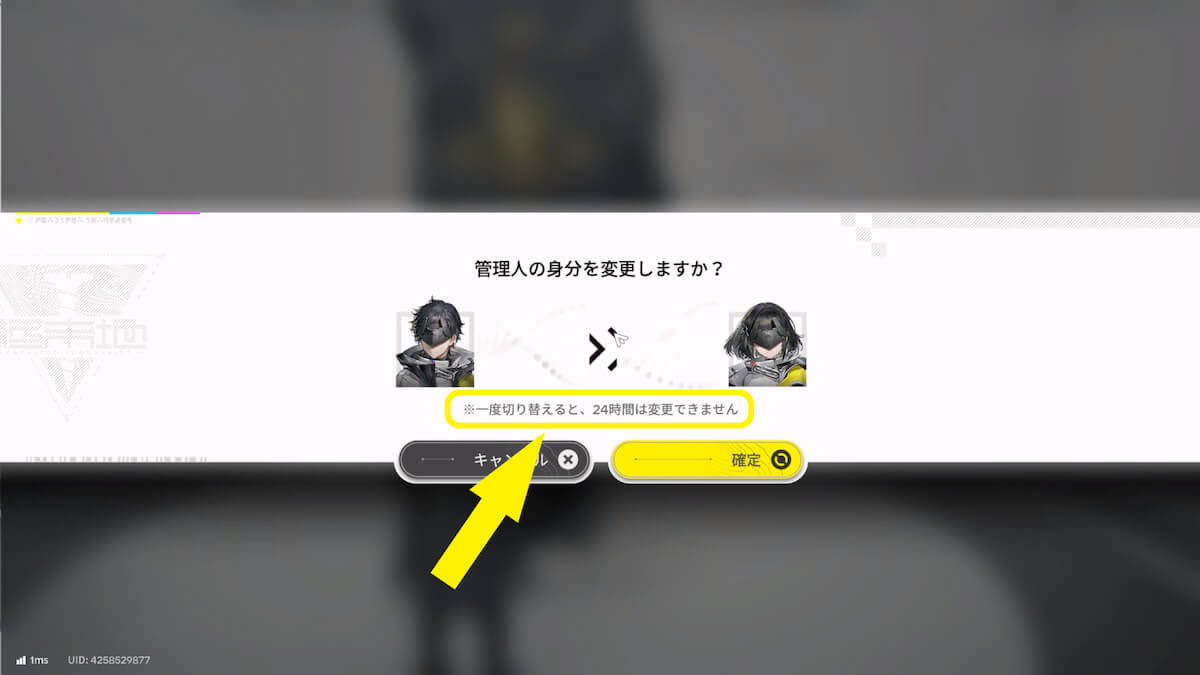 管理人の身分(見た目)を切り替えると、24時間は変更できなくなります。