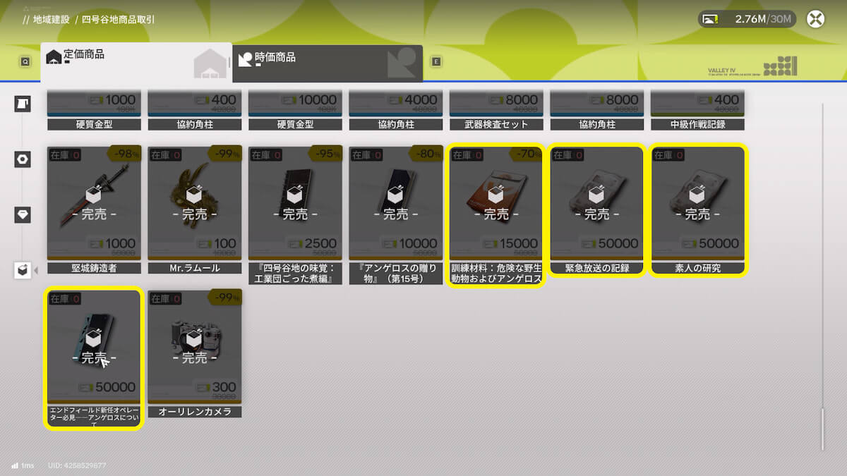 四号谷地の「商品取引」を開いて「定価商品」タブを見ると、アンゲロスの手がかり4個を購入できます。