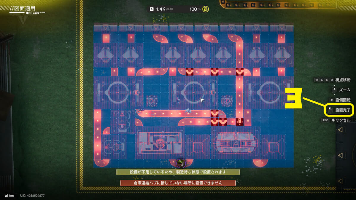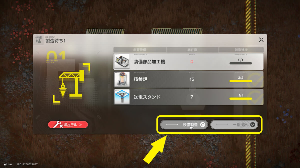 この状態を解除するには、白い射線が表示されている部分をクリックし、設備を製造して提出しましょう。