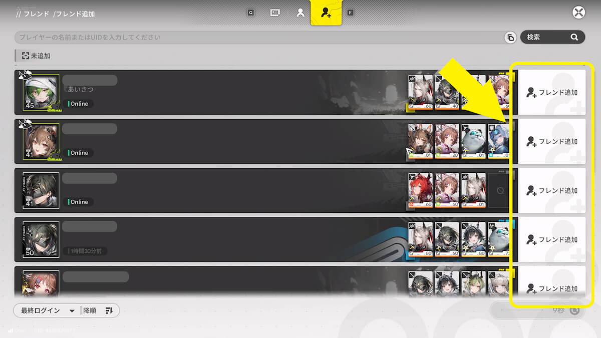 上部のタブを「フレンド追加」に切り替えると他プレイヤーが表示されるため、「フレンド追加」を押してフレンド申請を送りましょう。