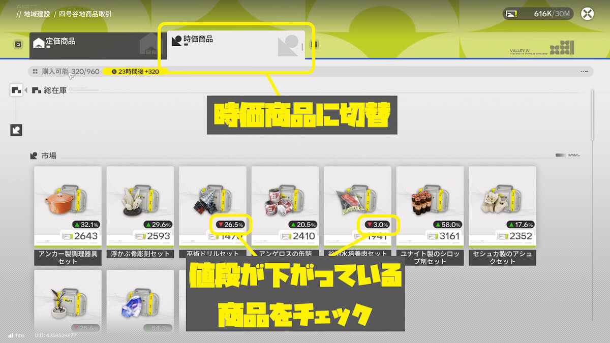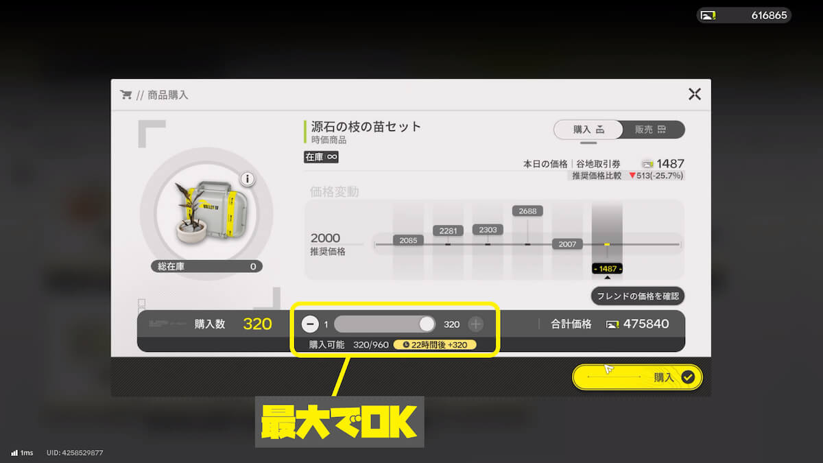 「時価商品」タブに切り替え、上部に表示されている購入可能数を確認します。購入可能数は時間経過で回復するため、上限に達して無駄にならないよう注意が必要です。