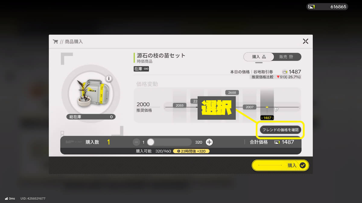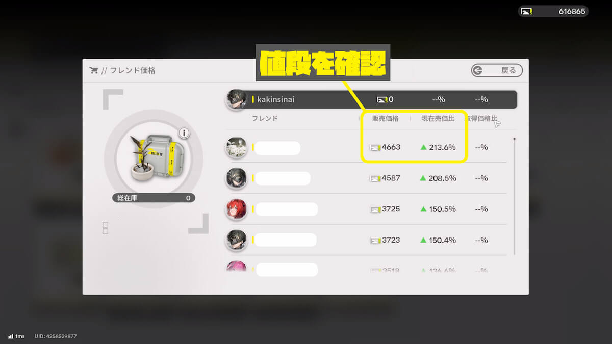 商品をクリックした後、右端にある「フレンドの価格を確認」を選択します。