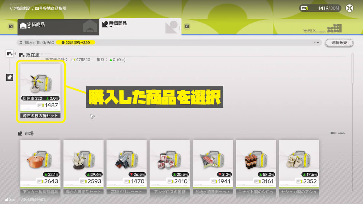 左側の「変更」で四号谷地と武陵を切り替えられます。時価商品の購入制限はマップごとに異なるため、以下の操作をそれぞれ2回ずつ行う必要があります。