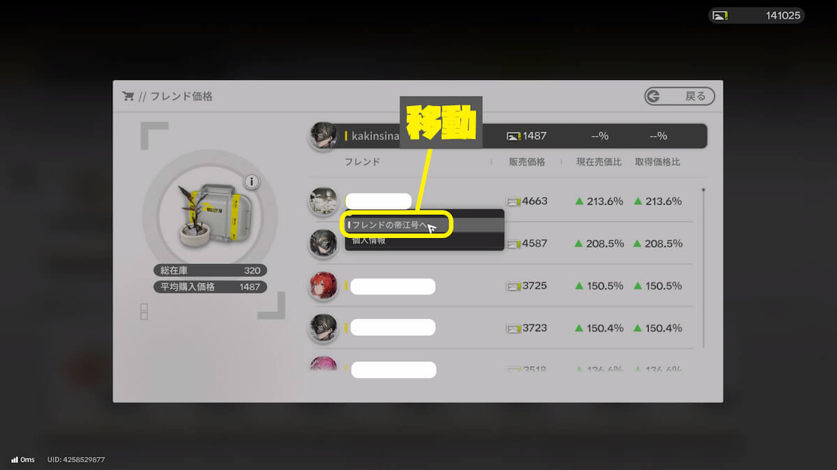 すると、フレンドの帝江号での販売価格が一覧で表示され、自分との差額を確認できます。このやり方で他の商品も確認し、一番儲けが出る物を探しましょう。