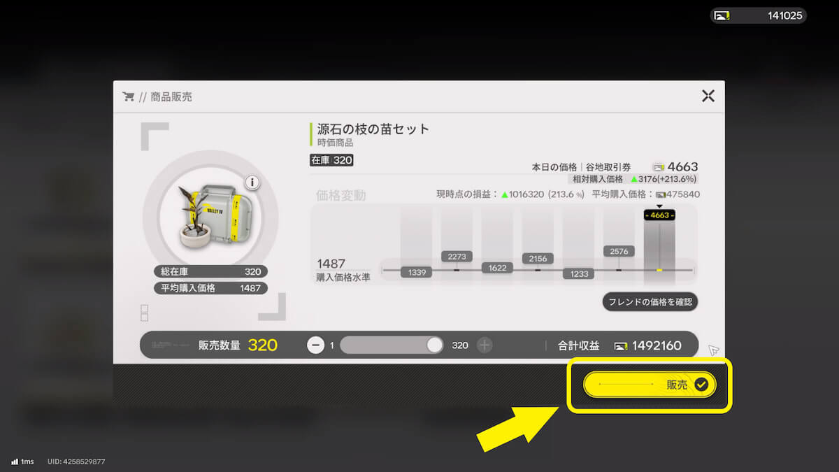 商品一覧から自分が購入した商品を選択し、販売しましょう。これで時価商品の転売は完了です。