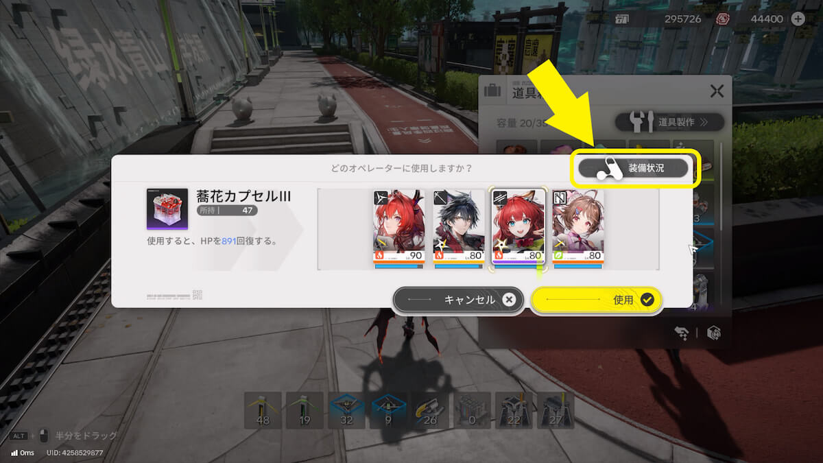 続いて右上にある「装備状況」を開くと、編成中のオペレーターが表示されるため、戦闘補助アイテムを装備しましょう。