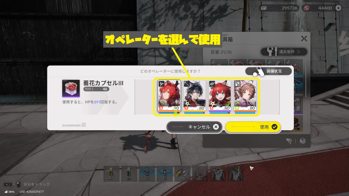 続いて一覧からオペレーターを選び、再び「使用」を選択すると、戦闘補助アイテムを使用できます。