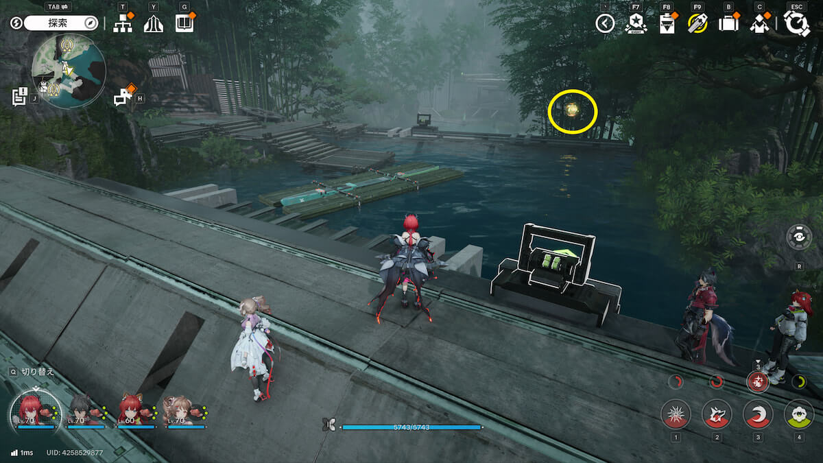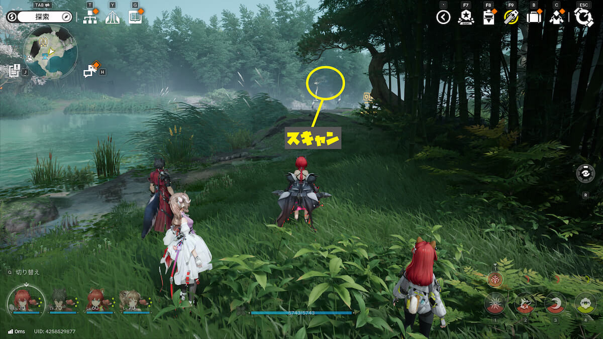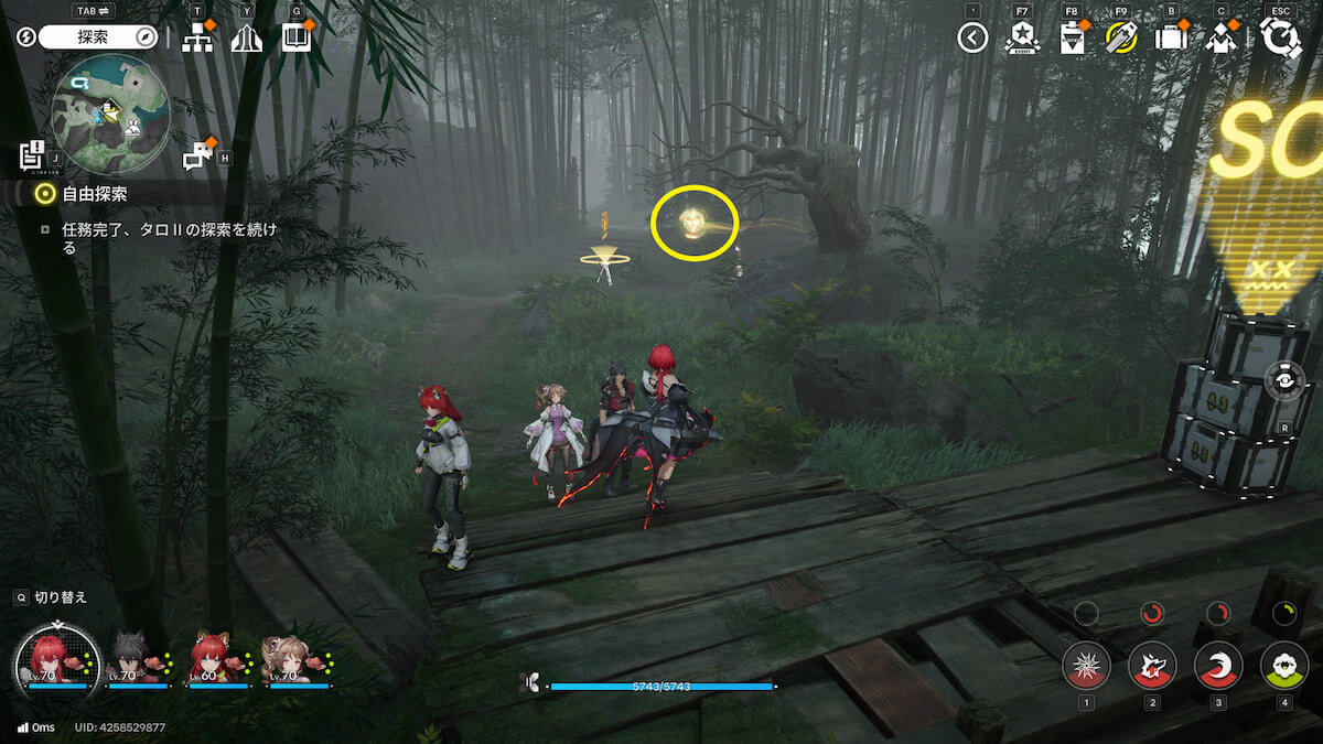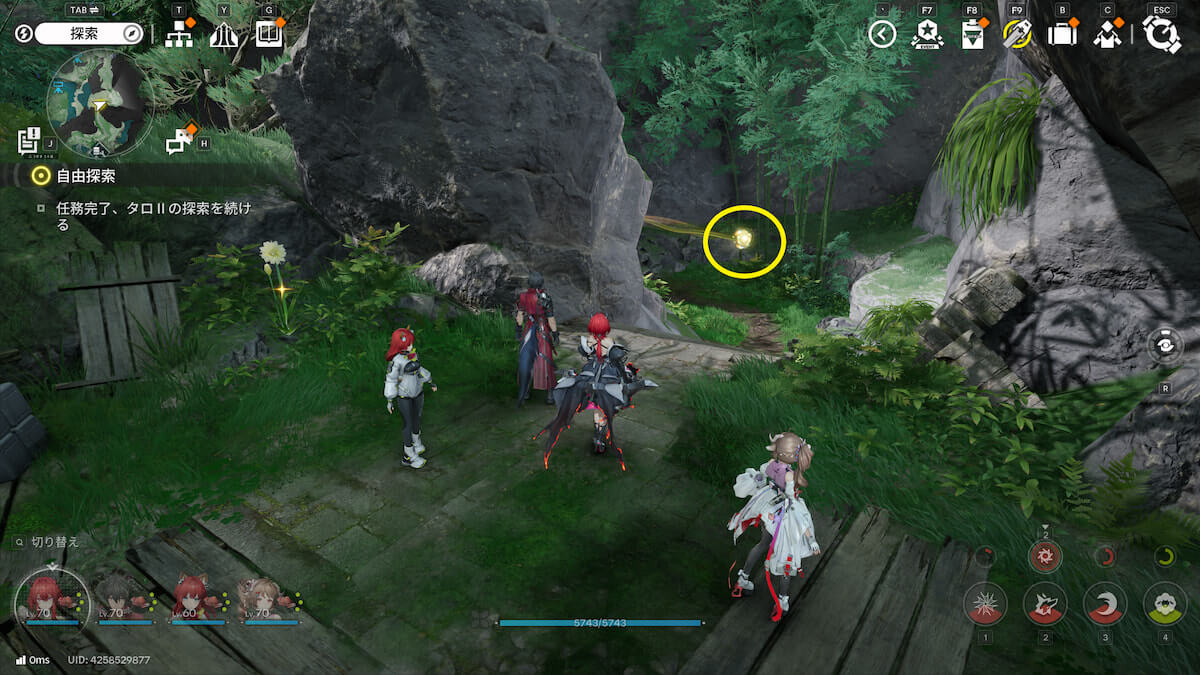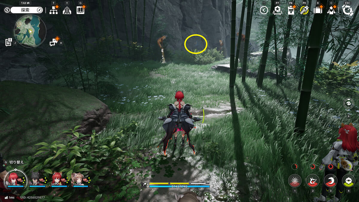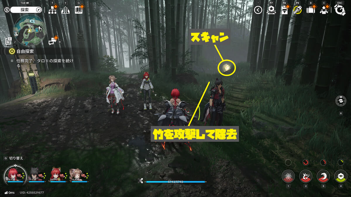 マップ画像5番の位置。モヤをスキャンし、通り道にある竹を攻撃して除去すると、オーリレンを発見できます。