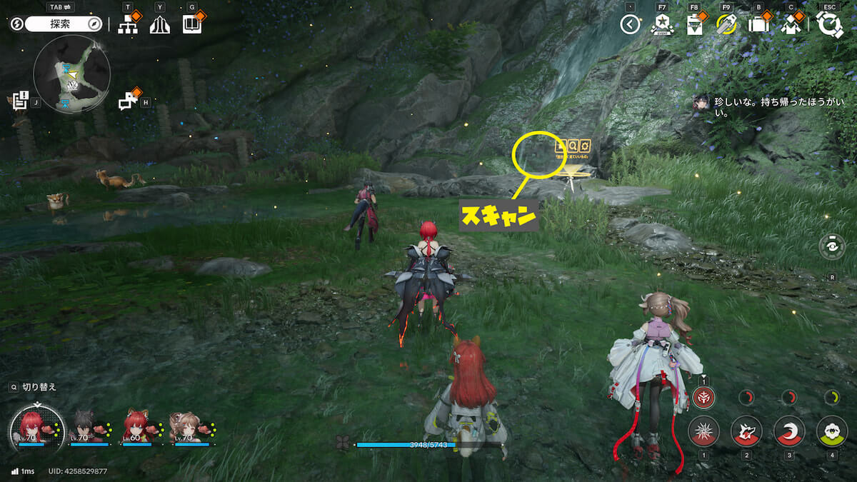 マップ画像13番の位置。3匹の狐が見つめてるモヤをスキャンすると、オーリレンを発見できます。