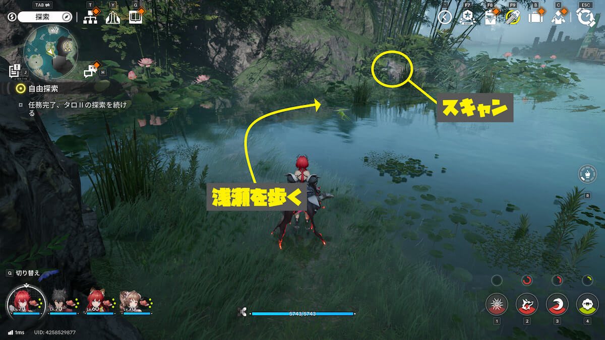 マップ画像4番の位置。浅瀬を歩き、奥のモヤをスキャンすると、オーリレンを発見できます。