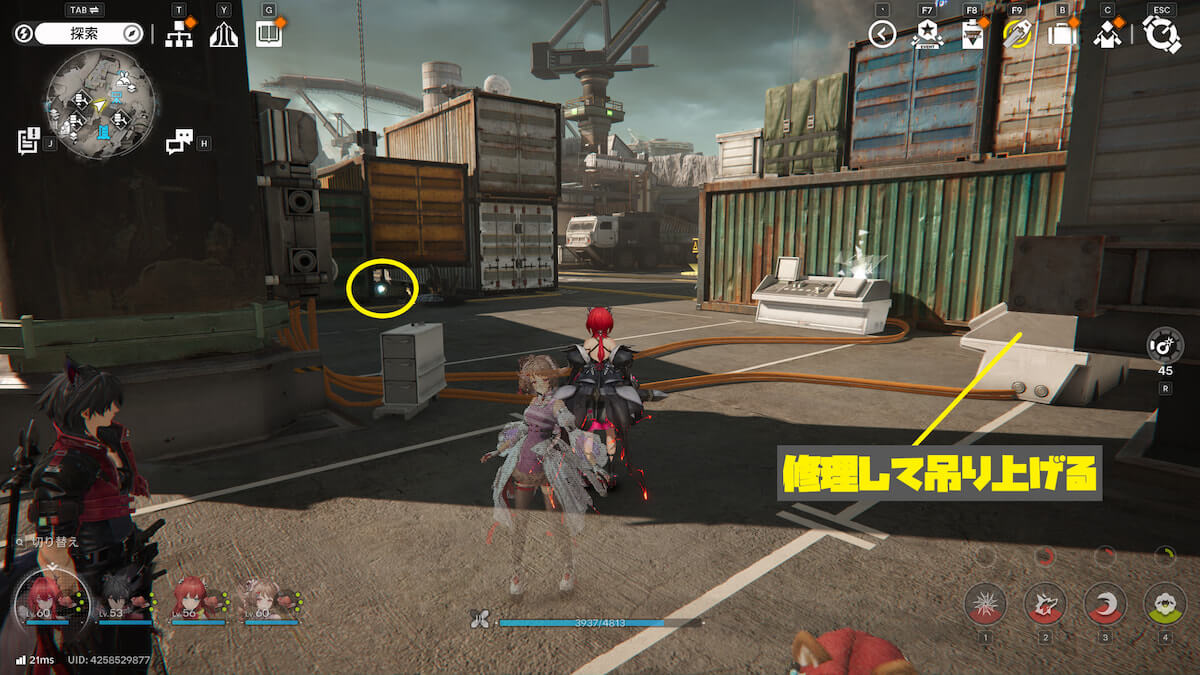 マップ画像15番の位置。画像の装置を修理して「コンテナを吊り上げる」を選ぶと、オーリレンを発見できます。