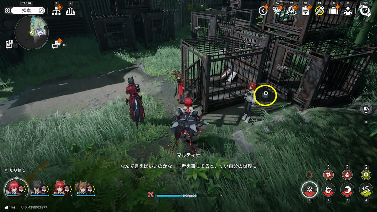 マップ画像2番の位置。広場に積み上げられた檻の後ろで、手がかり2「調教師の嘆き」を発見できます。