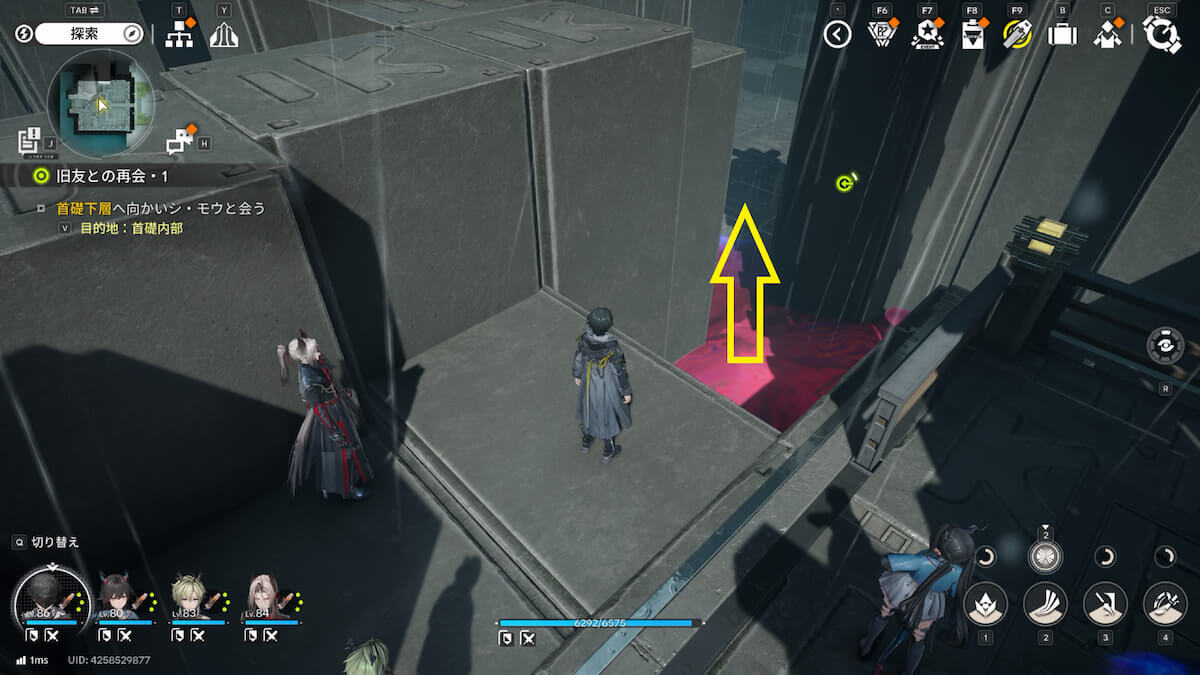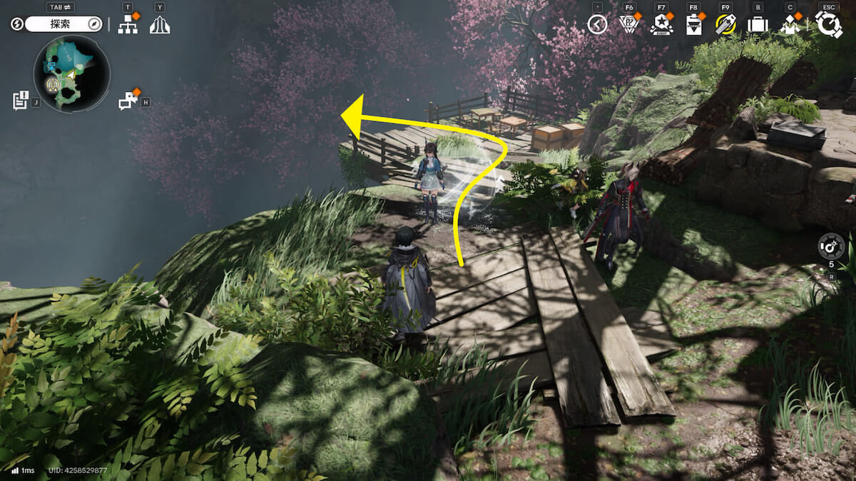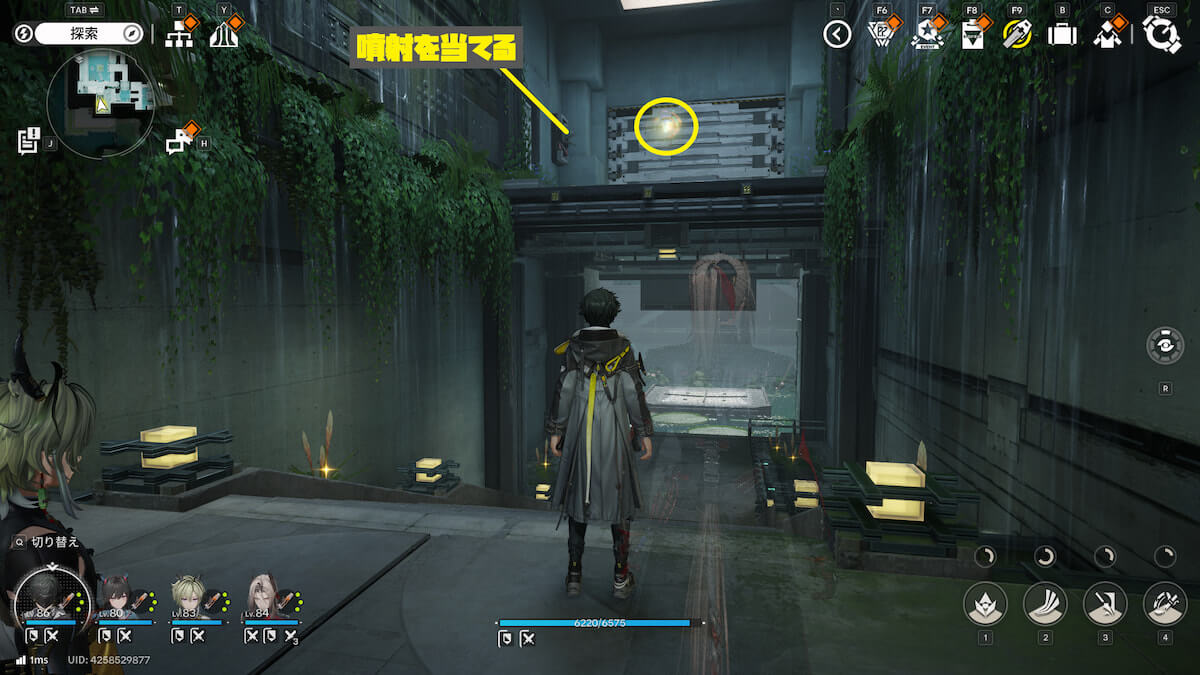 マップ画像7番の位置。湖の足場を使って南の通路に移動し、噴射でゲートを解放します。