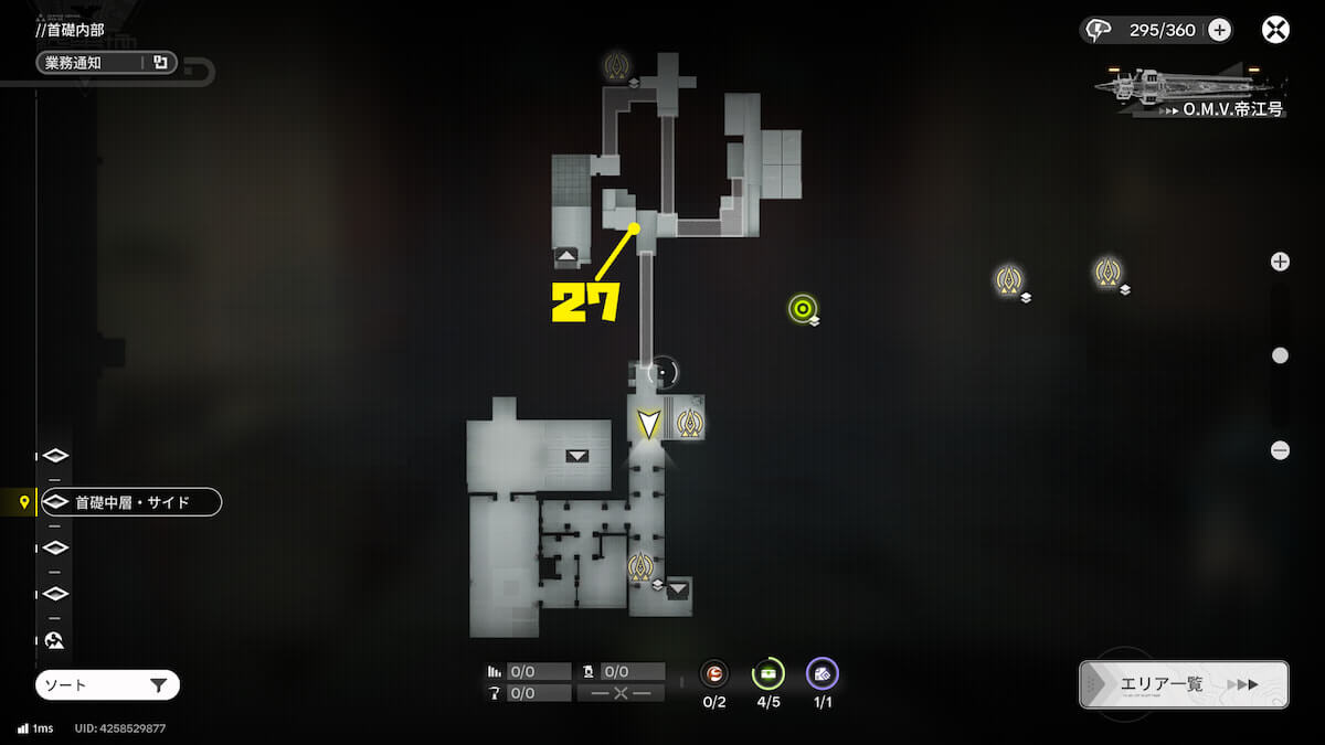マップ画像27番の位置。首礎中層・メイン北西の出口から首礎中層・サイドに移動すると、オーリレンを発見できます。