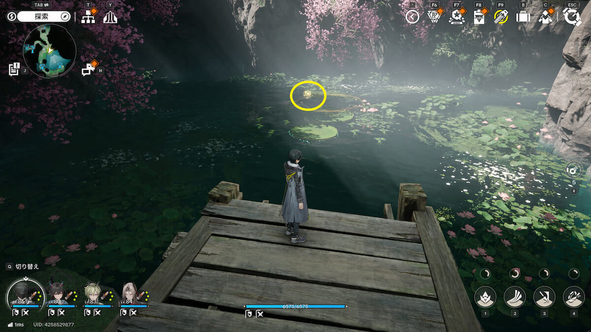 マップ画像6番の位置。5番から湖の足場を使って西の通路に進むと、オーリレンを発見できます。
