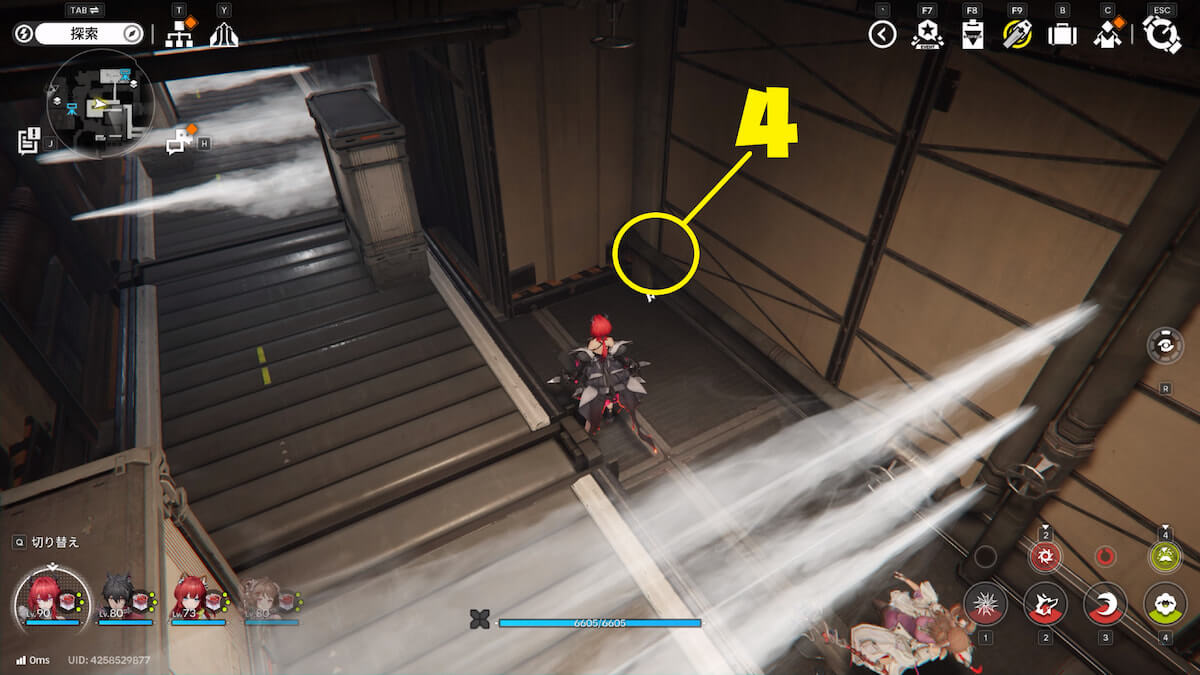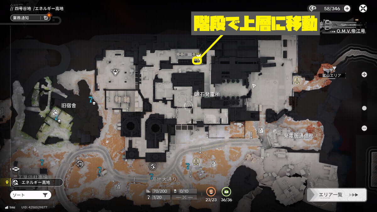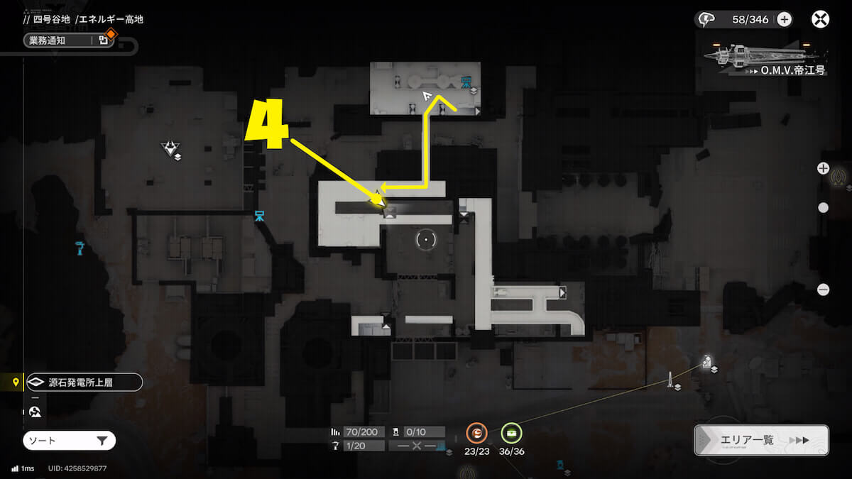 マップ画像4番の位置。源石発電所の上層で、手がかり4「実験の行方を案じるメモ」を発見できます。