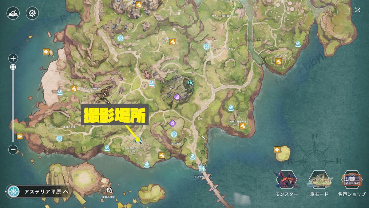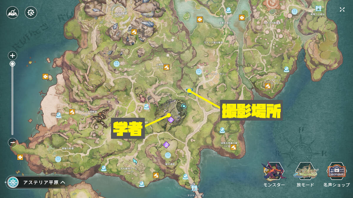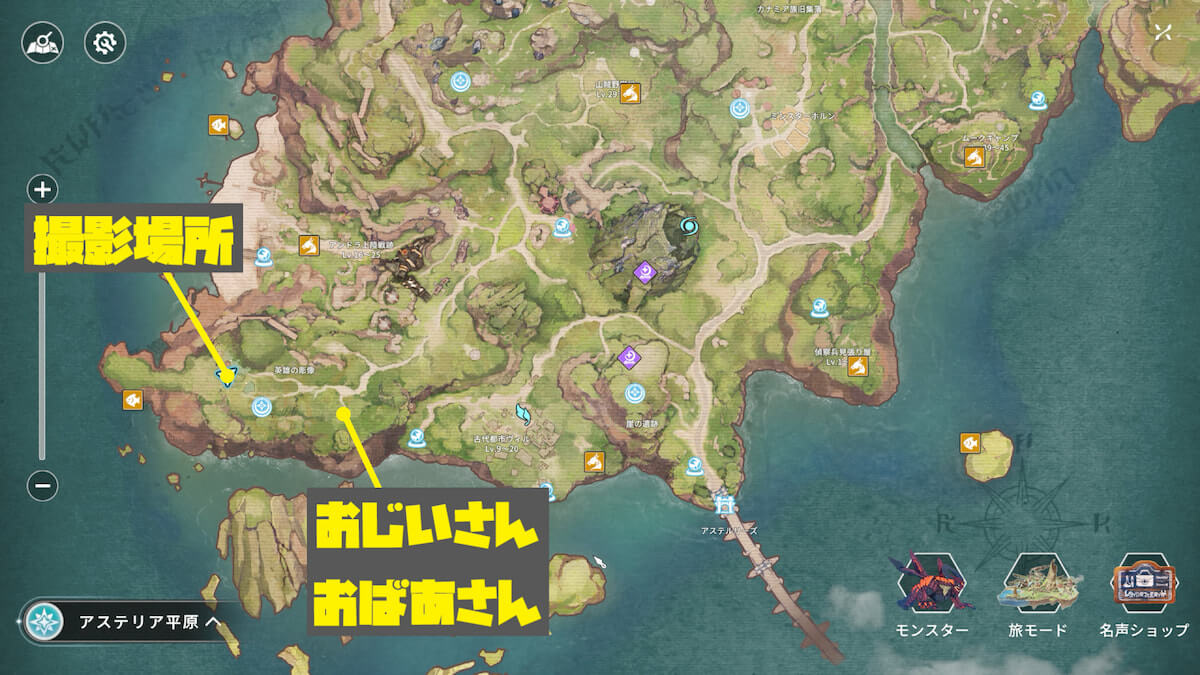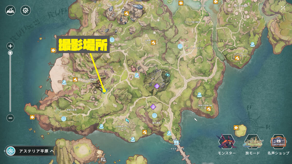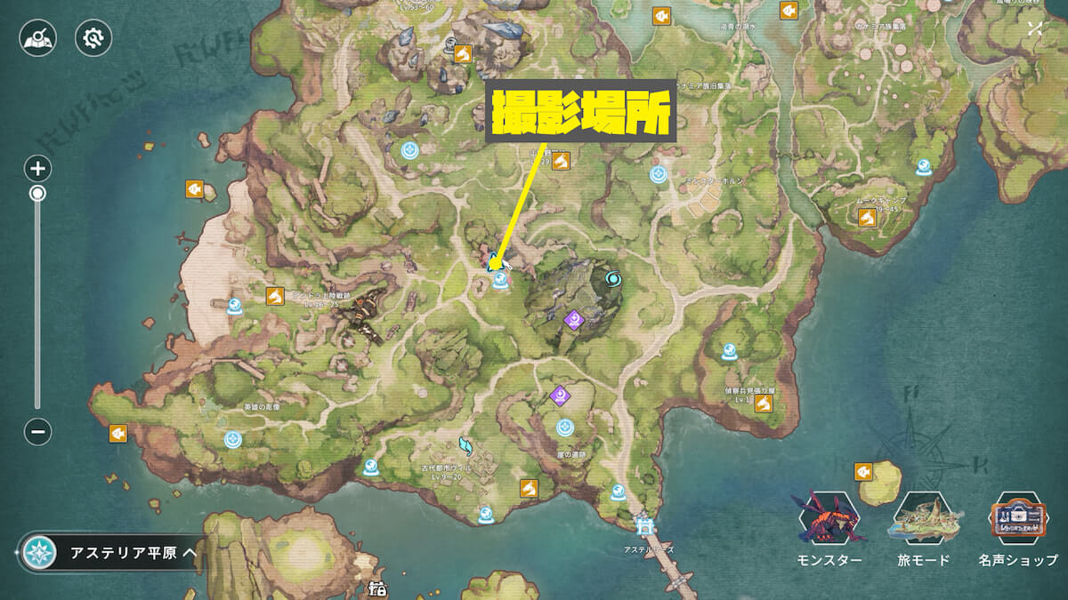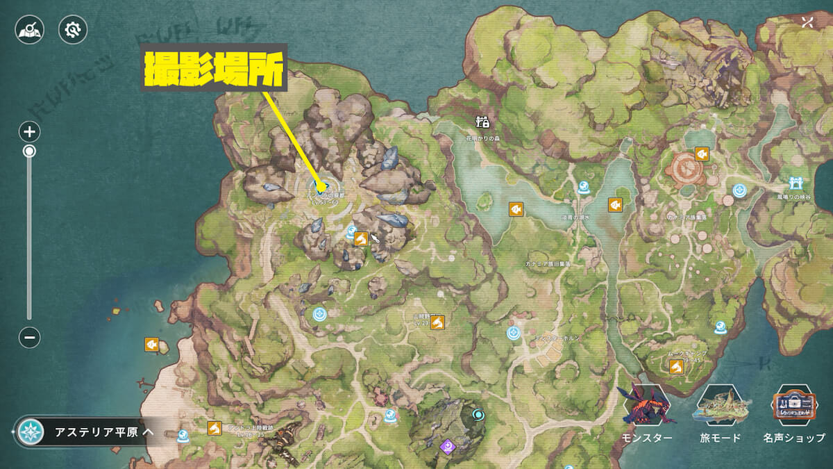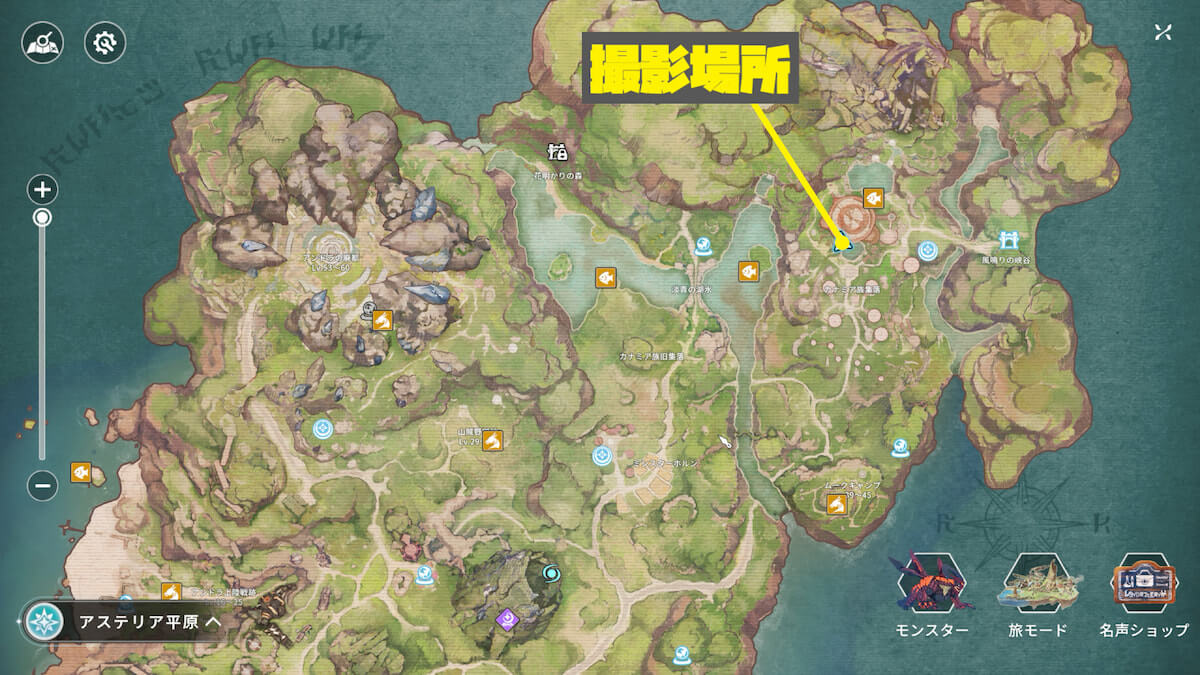 アステリア平原のマップから「旅モード」を開くと、撮影クエストを確認できます。