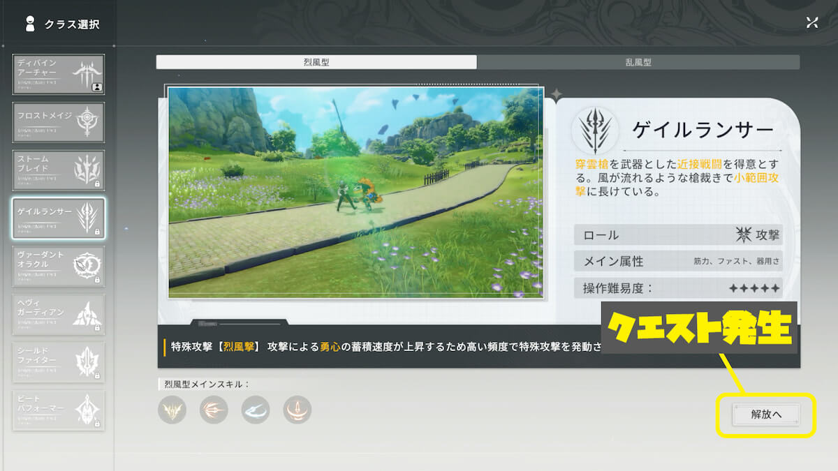 左側のタブで解放したいクラスを選び、「解放へ」を押して発生するクエストをクリアすると、そのクラスを解放できます。