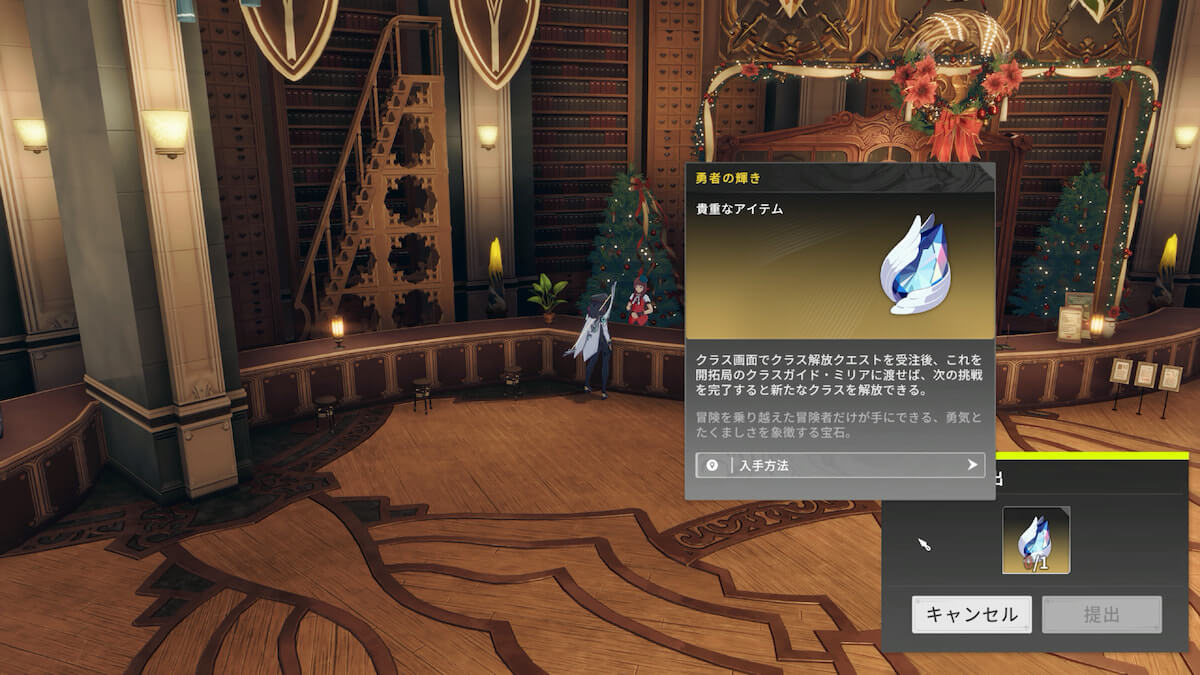 クラスの解放クエストを進めるにはアイテム「勇者の輝き」が1つ必要です。