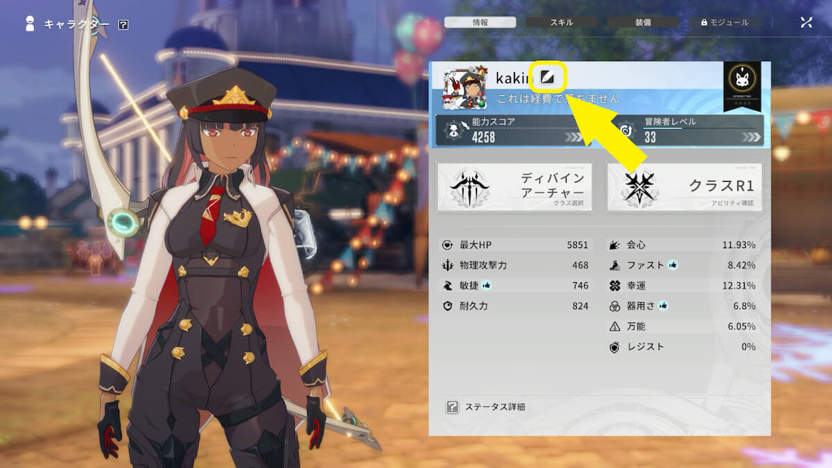 「キャラクター」画面に移動し、自身の名前の横にあるアイコンを押すと、名前を変更できます。