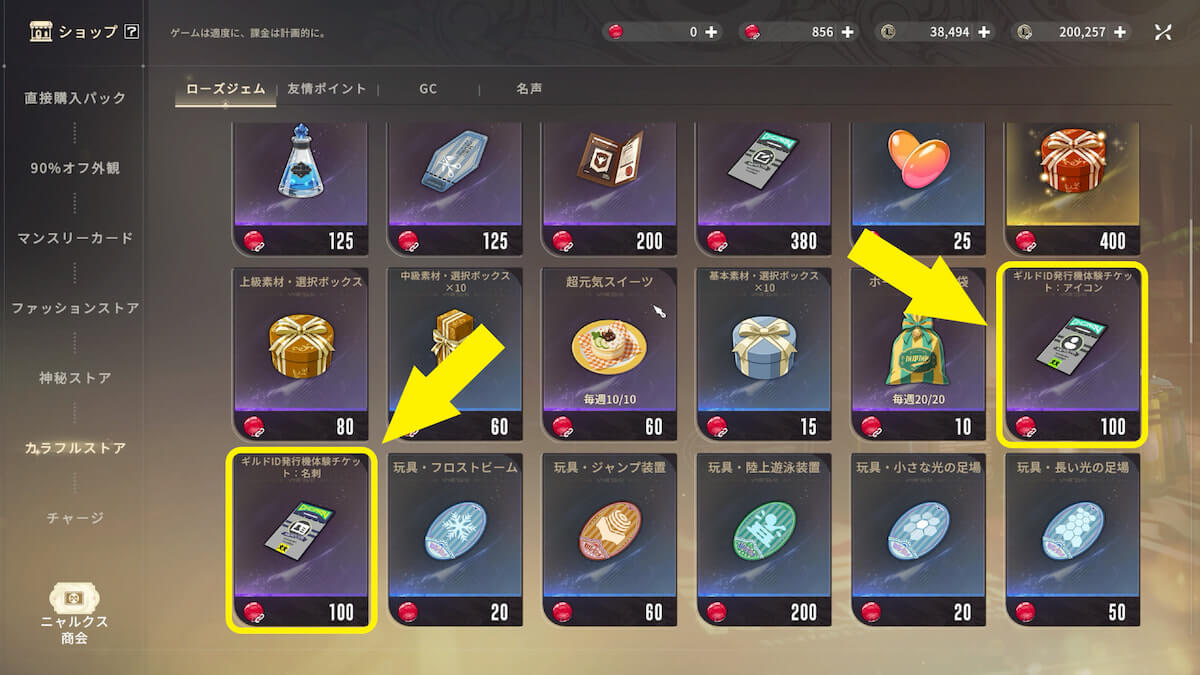 カラフルストアで「ギルドID発行機体験チケット:アイコン」か「ギルドID発行機体験チケット:名刺」を購入します。