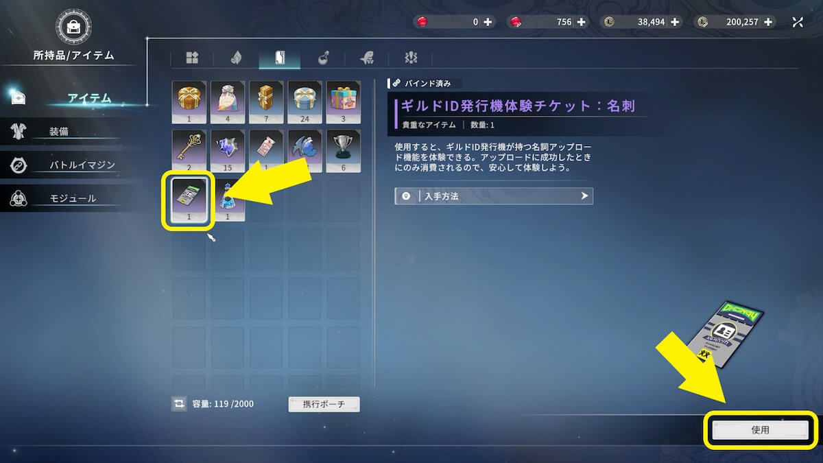 「ギルドID発行機体験チケット:アイコンor名刺」を使う