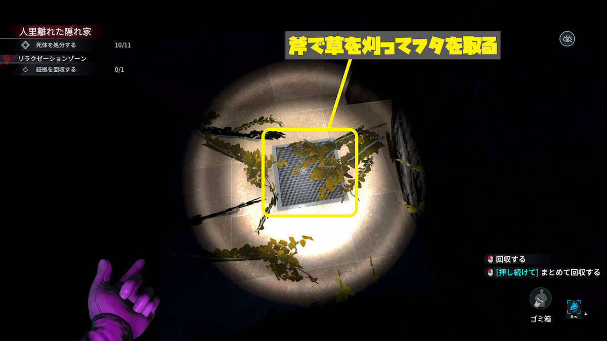 ステップラダーなどの段差を使って『リラクゼーションゾーン』の奥へ移動し、右の角にある草を刈ってフタを取ります。