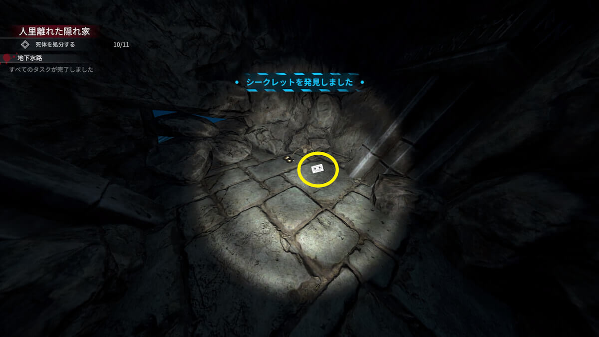 隠し階段で『地下水路』に入って進むと、突き当たりでシークレット1を発見し、カセット1「粘土のように」を入手できます。