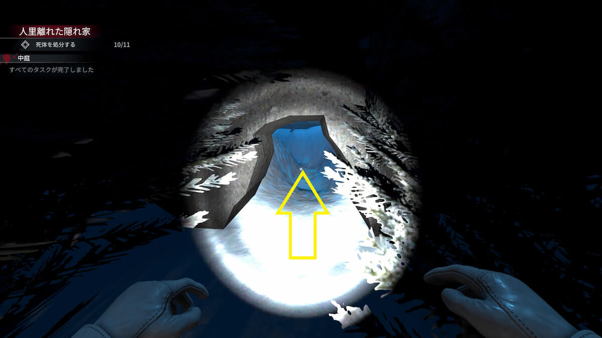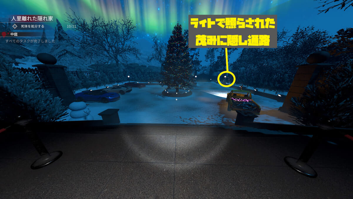 『中庭』の右奥に移動し、ライトで照らされた茂みにある隠し通路を通ります。