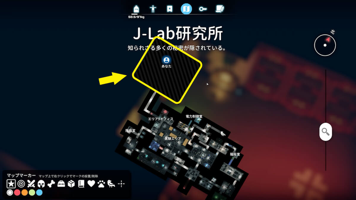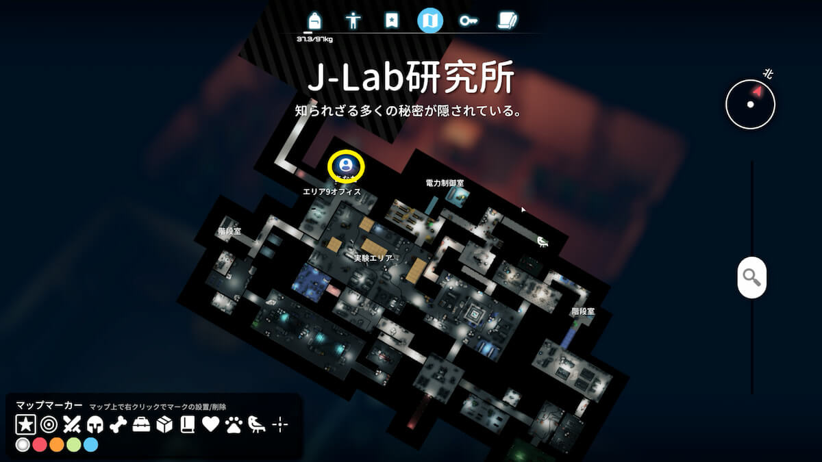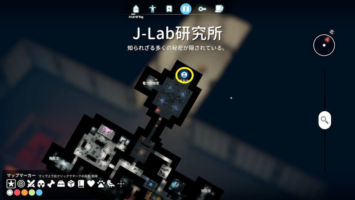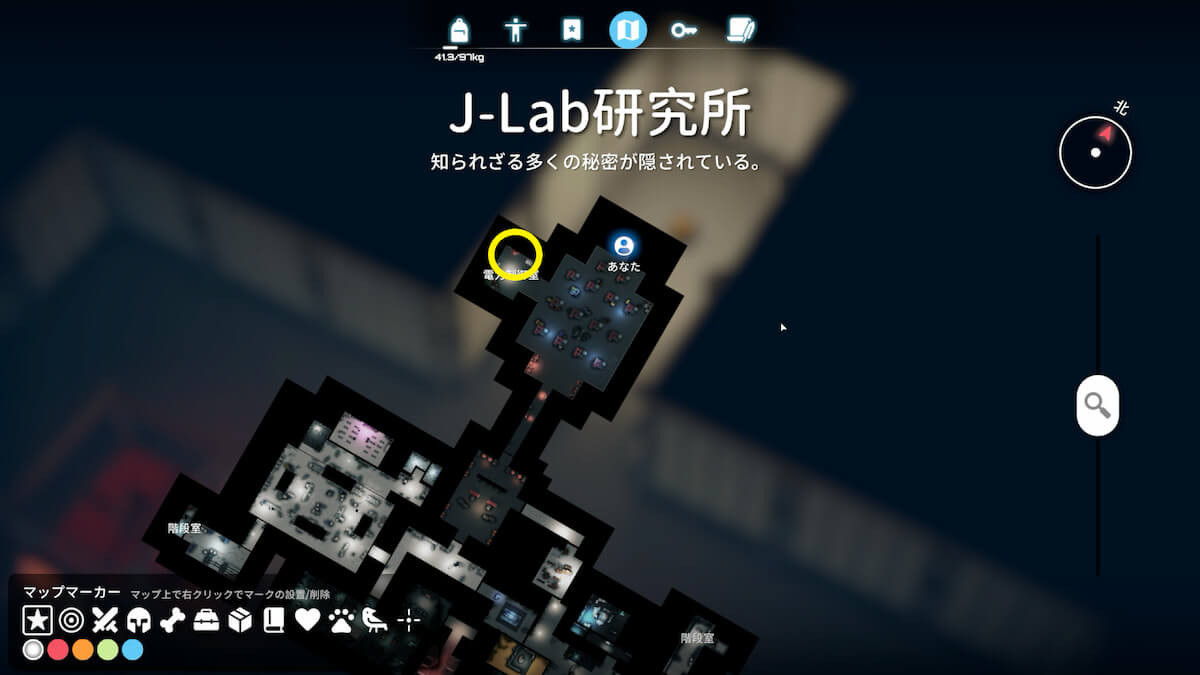 地下1階の電力制御室に入るには「J-Lab立ち入り証明レベル2」が必要です。このカギは、J-Lab研究所内の探索で入手できます。
