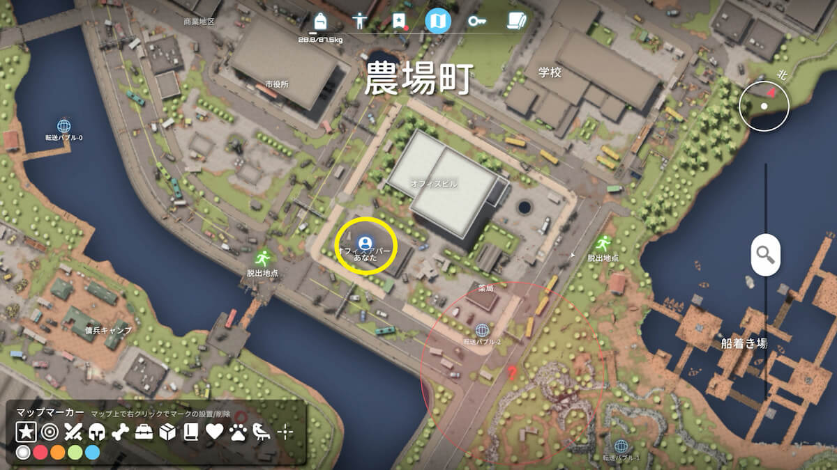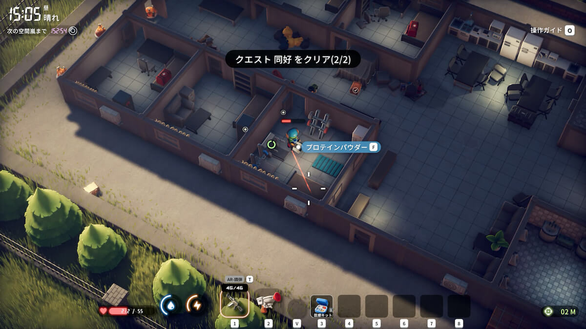 オフィスアパートの中にある画像の部屋(指定地点)に入るとクエストが進行し、プロテインパウダーを発見できます。