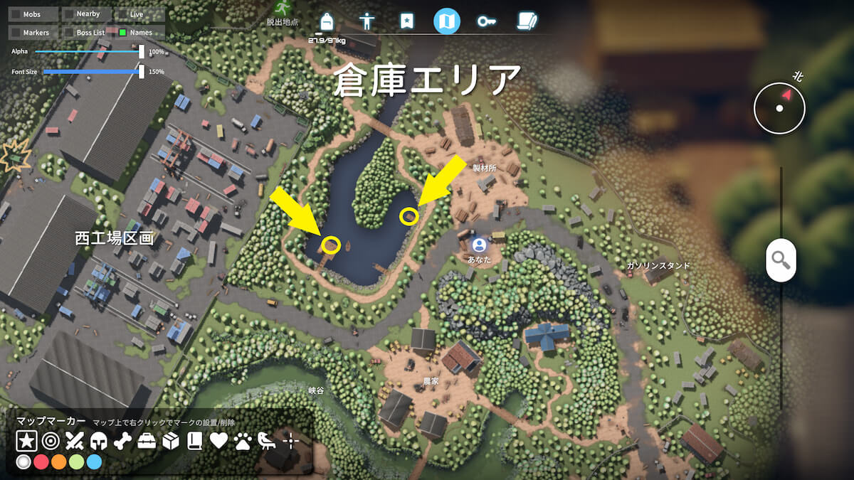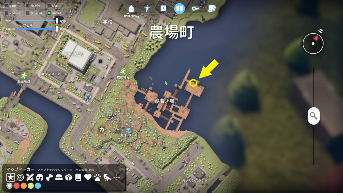 下で紹介している桟橋に移動し、釣り竿を装備して釣りを開始しましょう。