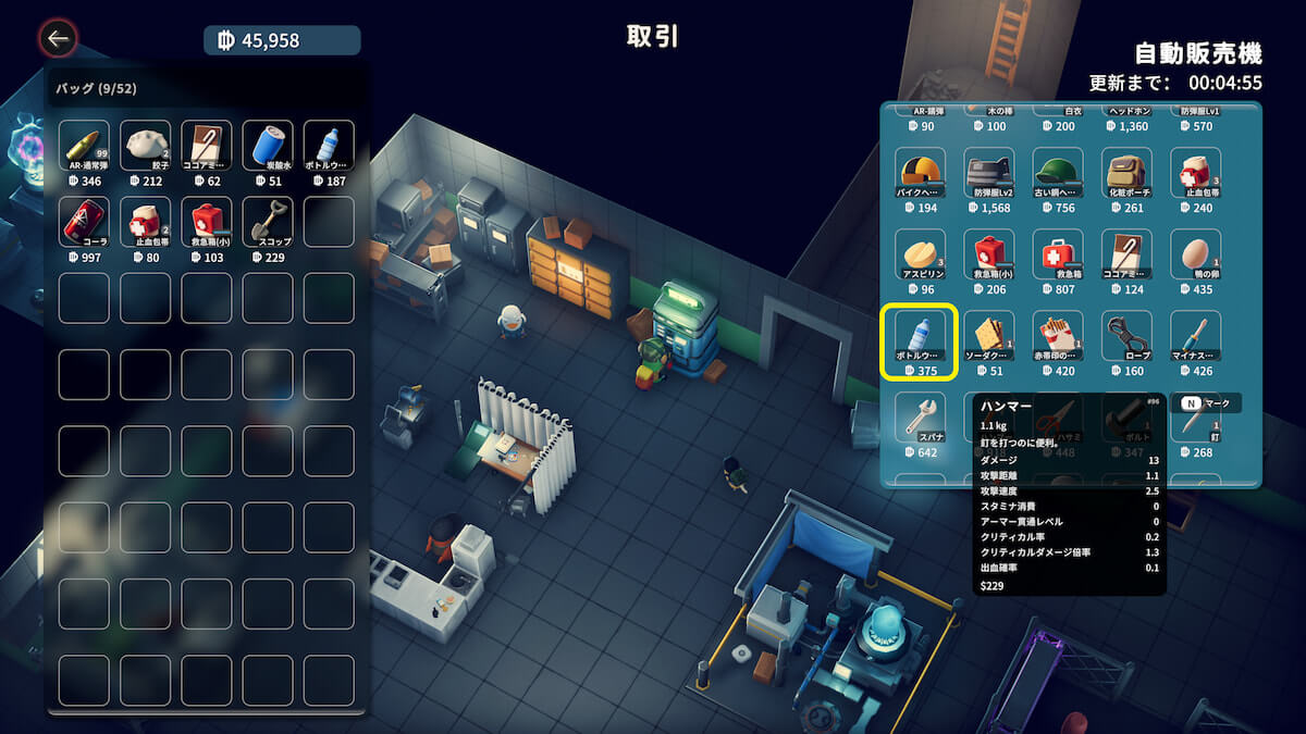 ボトルウォーターは探索で簡単に集められますが、面倒な場合は自動販売機から購入できます。