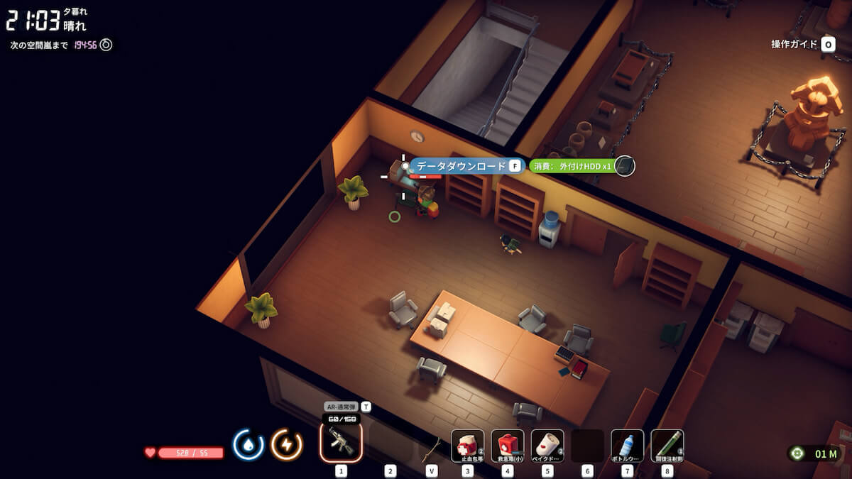 オフィスビルに入り、2階の部屋にあるPCに外付けHDDを使うと、推力偏向装置の研究ログを入手できます。