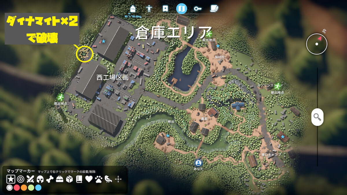 • 倉庫エリア西のフェンスをダイナマイト×2で破壊して移動