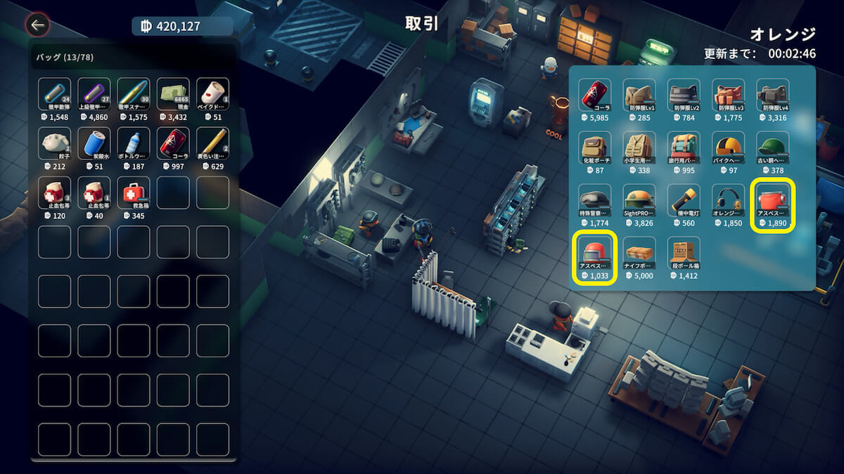 受け取る荷物が火の中にあるため、事前にオレンジから耐火装備「アスベスト作業ヘルメット」と「アスベスト作業服」を購入しておきましょう。
