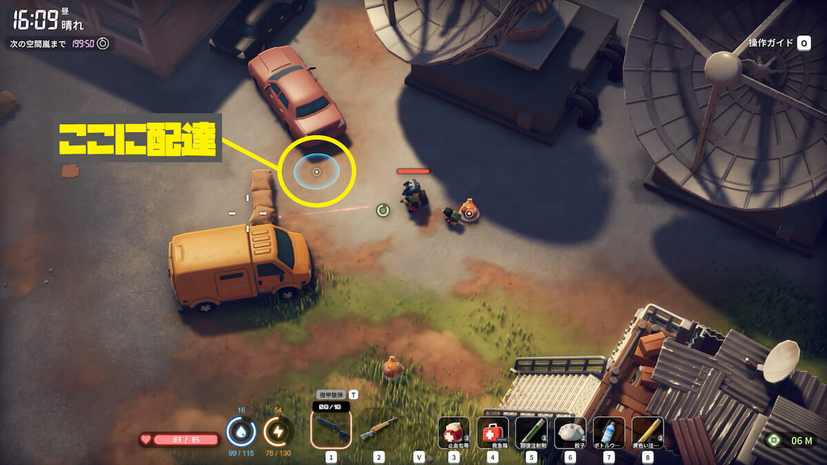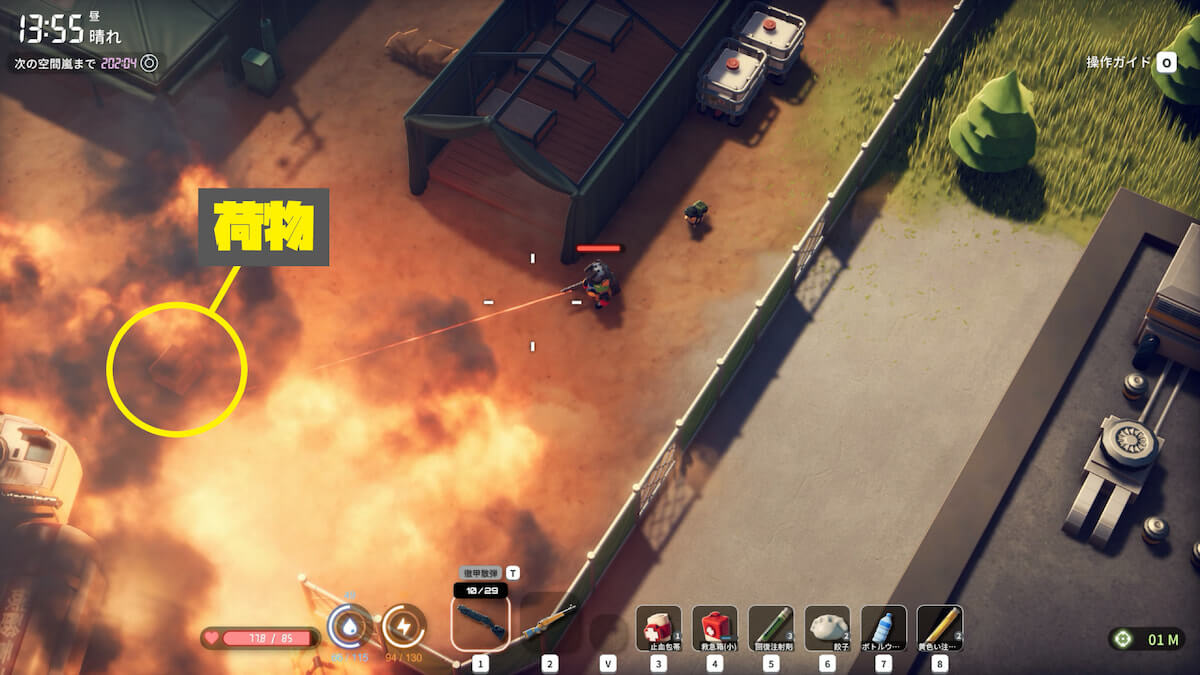 • 倉庫エリア西のフェンスをダイナマイト×2で破壊して移動