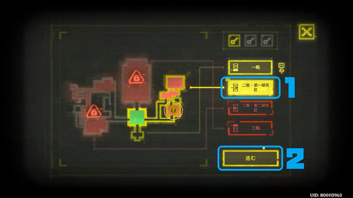メイン制御端末を調べたら「二階・第二研究区」を選択しましょう。