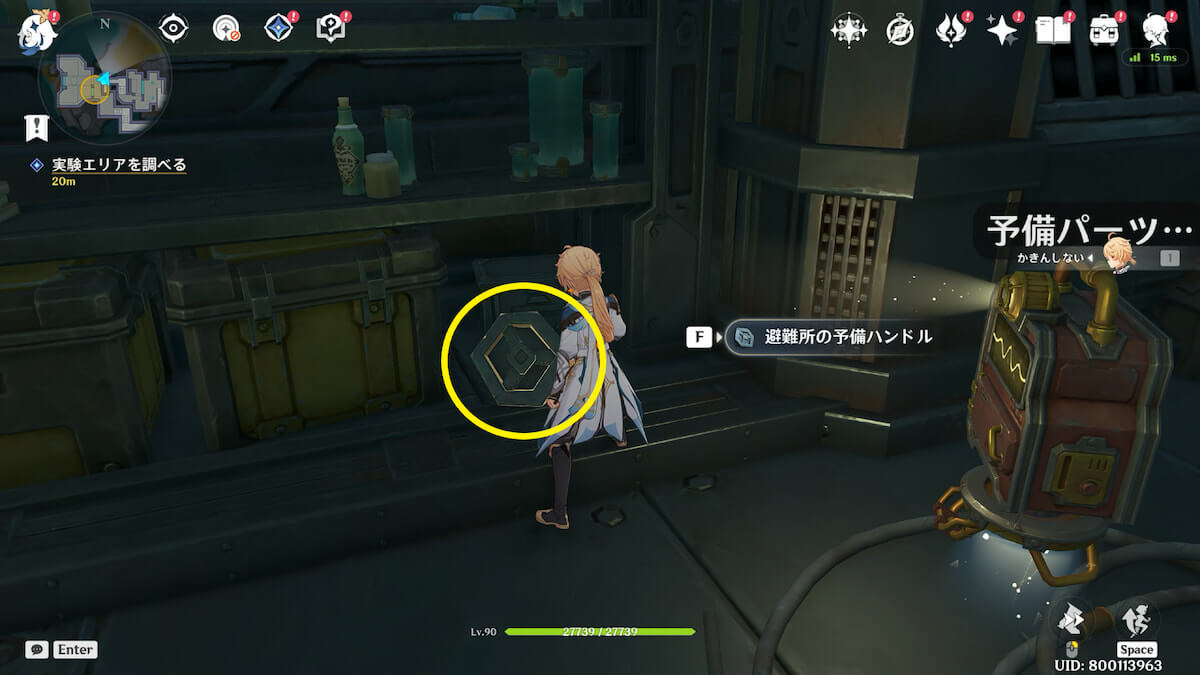 ダクトを通って部屋に入ったら「避難所の予備ハンドル」を拾い、ガラスの前に設置して制御端末を調べます。