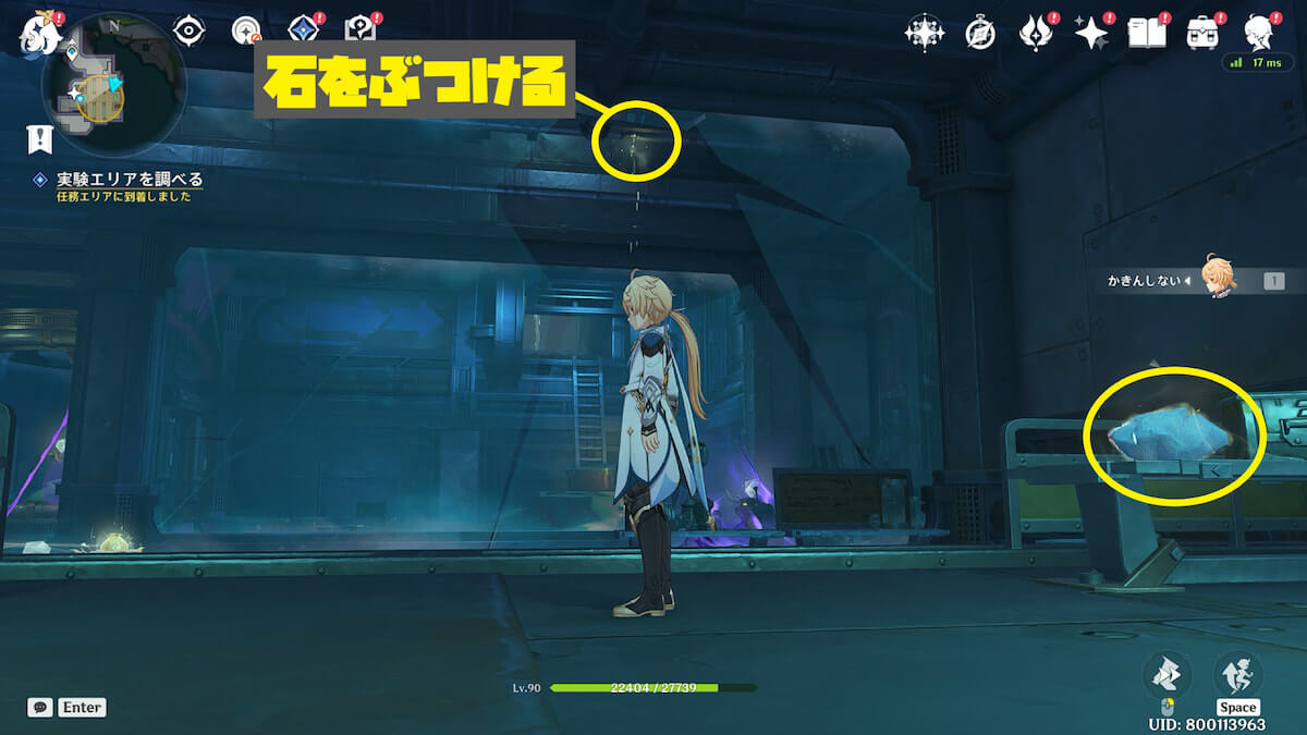 部屋に入ったら、奥の管に石をぶつけます。