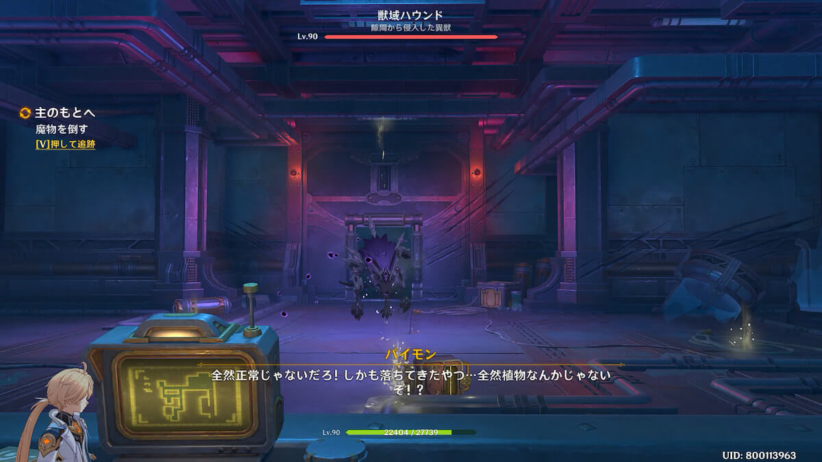 リフトで上階へ移動し、奥の部屋にある端末を調べると「獣域ハウンド」が出現します。
