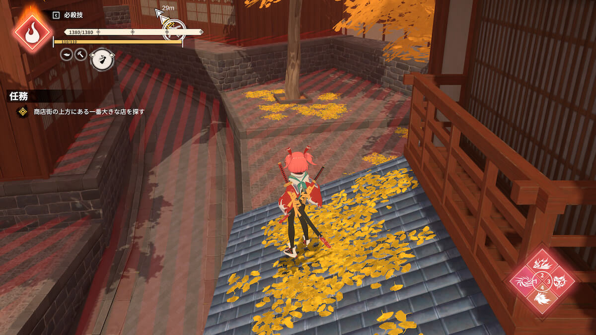 ステージ4番犬双子の目標「商店街の上方にある一番大きな店を探す」で、赤い地面に下りると実績を獲得できます。