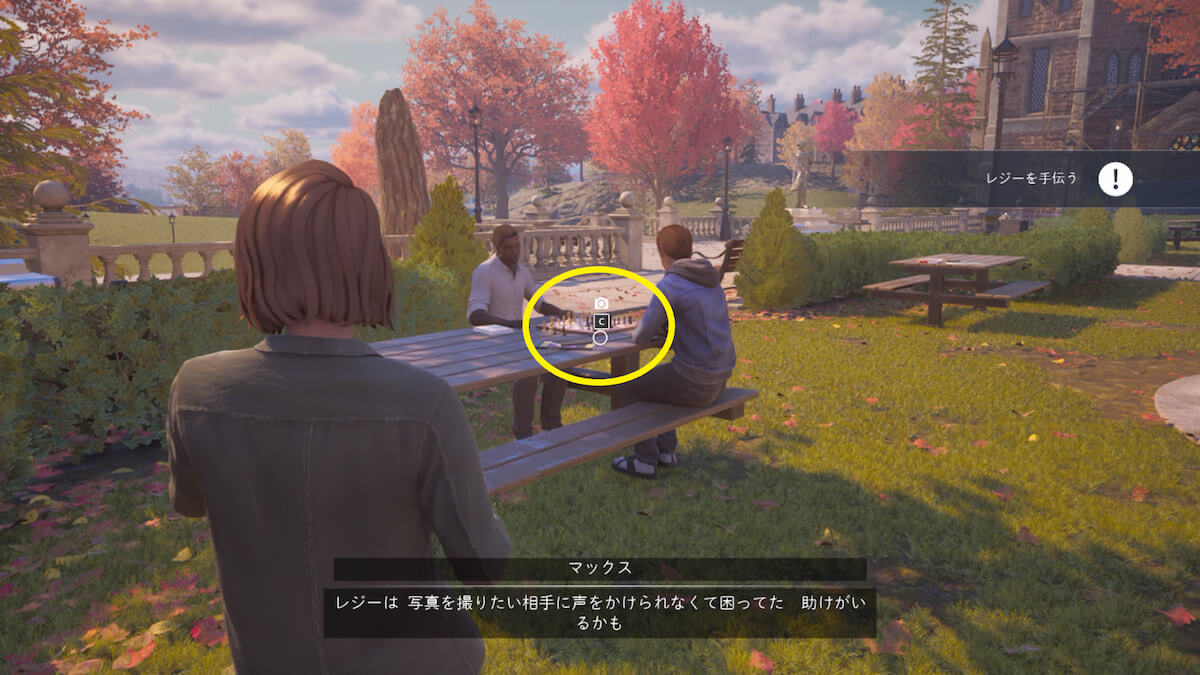 開始地点から右側のレジーがいるエリアに移動し、座っている学生を撮影すると、写真「学生を発見!」を入手できます。