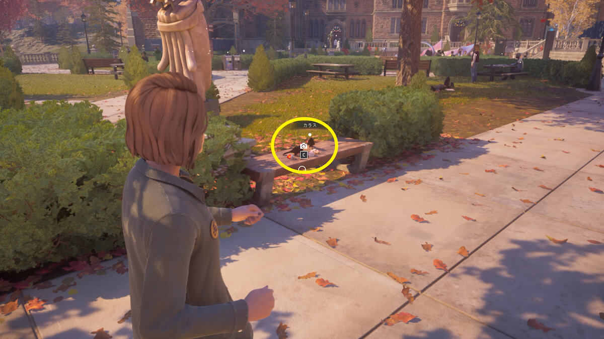 開始地点から右奥のベンチでカラスを撮影すると、写真「カラスを発見!」を入手できます。