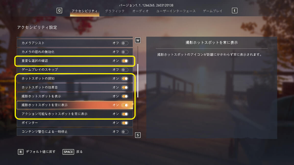 収集品や調べられる場所を見逃さないために、画像▢部分の設定をオンにしておきましょう。