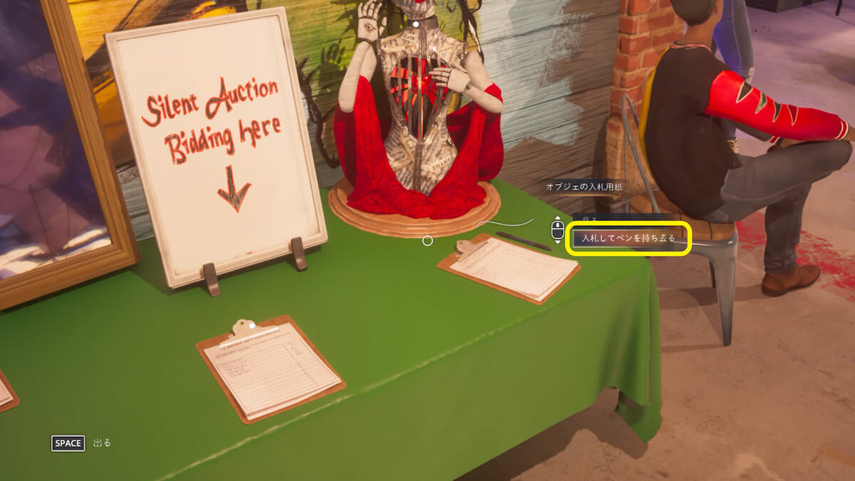 3. 目標:店を出る:店を出る前に再入札、イベント後に時間を戻して「入札してペンを持ち去る」を選ぶとトロフィー獲得