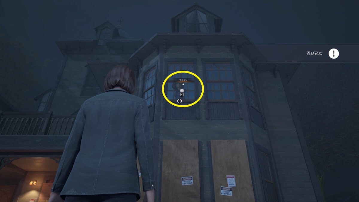 建物入口の左にある「板張りされた窓」を調べるとストーリーが進行するため、先に写真を撮影しましょう。