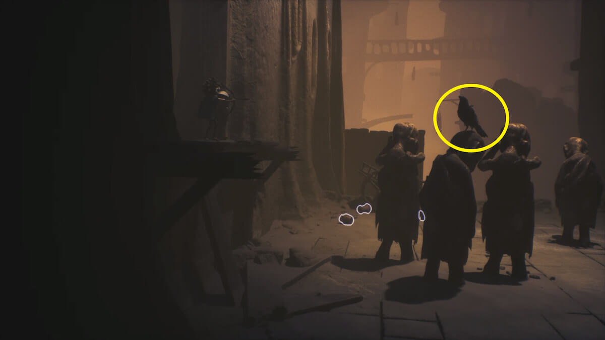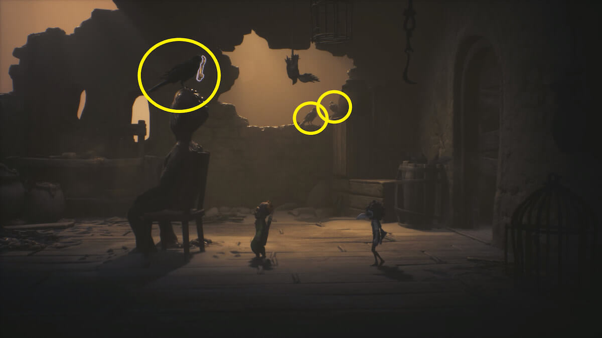 人形1とカラス1があった部屋を出て右側の通路に進むと、カラス2/11が見つかります。