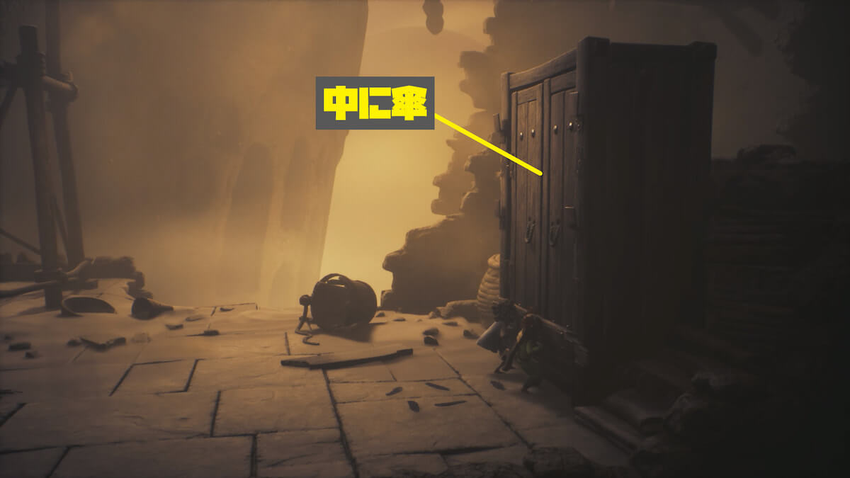大きな敵の手を確認した後、通路の右端にあるクローゼットから傘を入手できます。